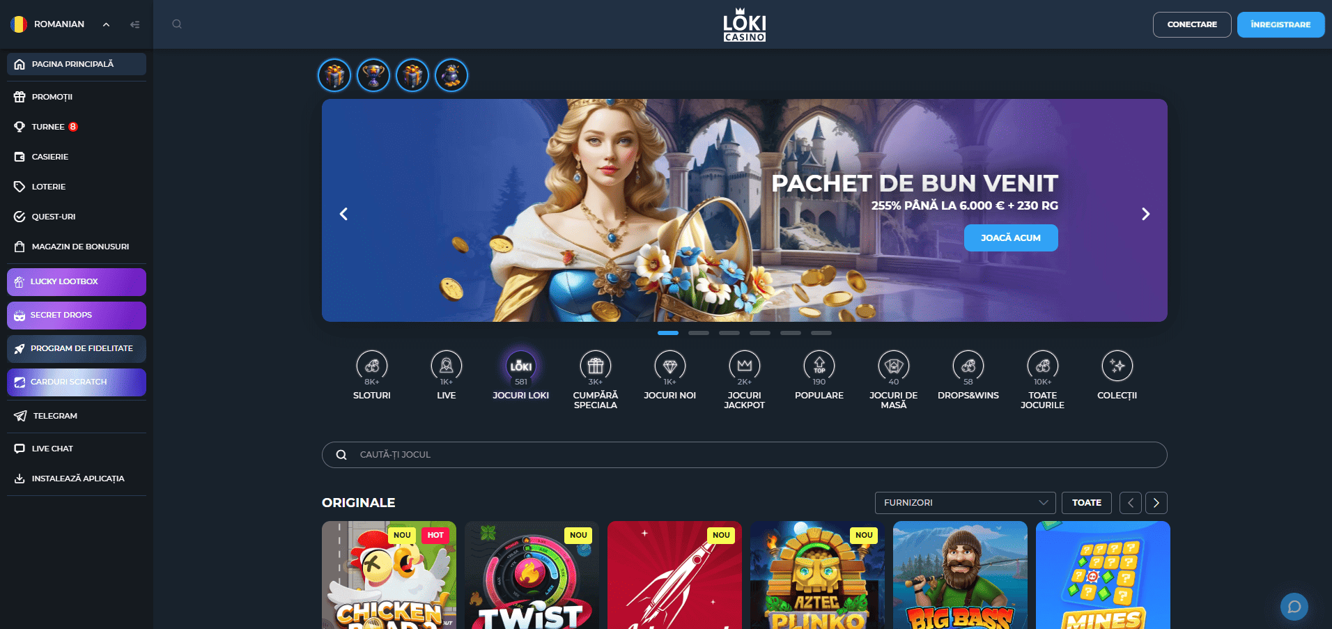 Loki Casino oferă o gamă largă de peste 8.000 sloturi online, inclusiv jocuri cu jackpot de la furnizori de top. Puteți vedea categorii separate numite Cumpără Speciala, Jocuri Jackpot, Jocuri Noi, Populare, Drops&Wins și Colecții.